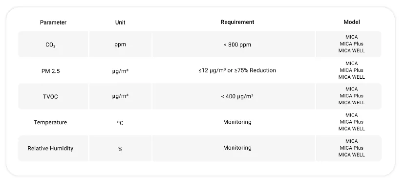 For a project to achieve RESET™ Air certification for commercial interiors, the indoor air quality parameters, controlled by continuous monitoring and calculated on a daily average based on occupancy hours, must be maintained within the limits listed below.