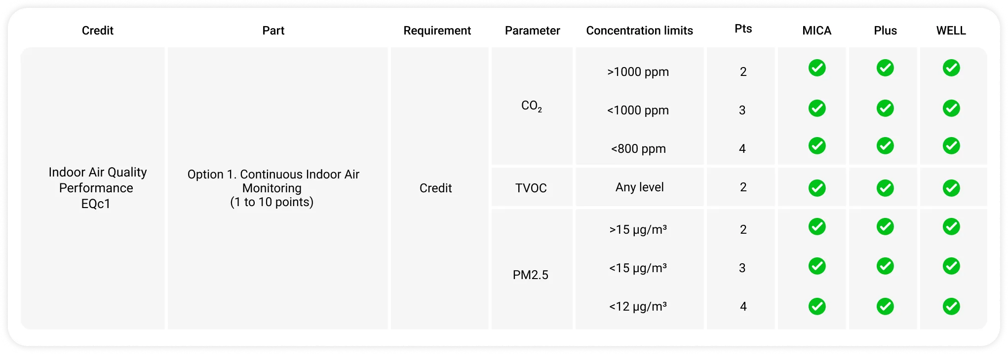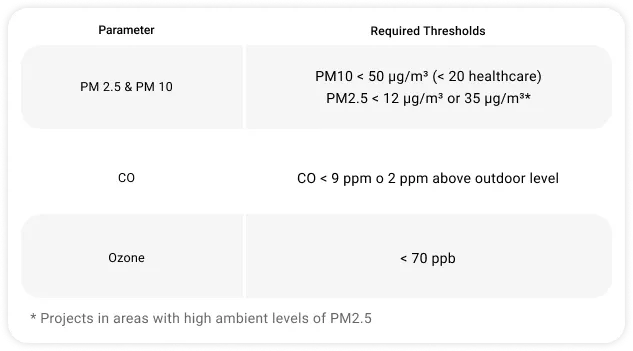 Des points peuvent être gagnés en installant des moniteurs qui suivent les principaux paramètres de qualité de l'air. En outre, des points supplémentaires sont attribués pour maintenir les concentrations dans les limites établies, permettant aux projets de gagner jusqu'à la totalité des 10 points.
